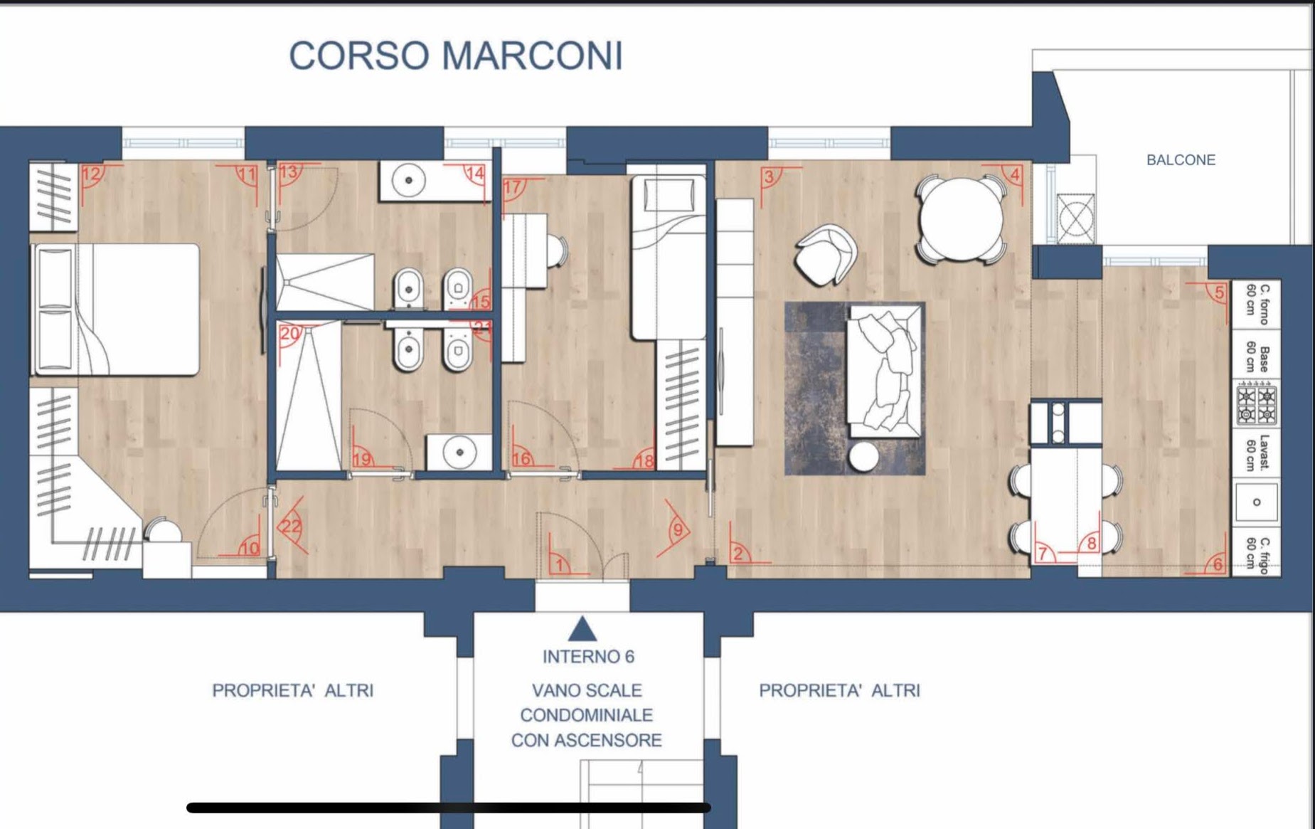 Proponiamo in vendita a Corso Marconi un elegante appartamento trilocale, completamente e finemente ristrutturato con materiali di alta qualità e finiture di pregio, situato al terzo piano con ascensore di un signorile stabile condominiale.